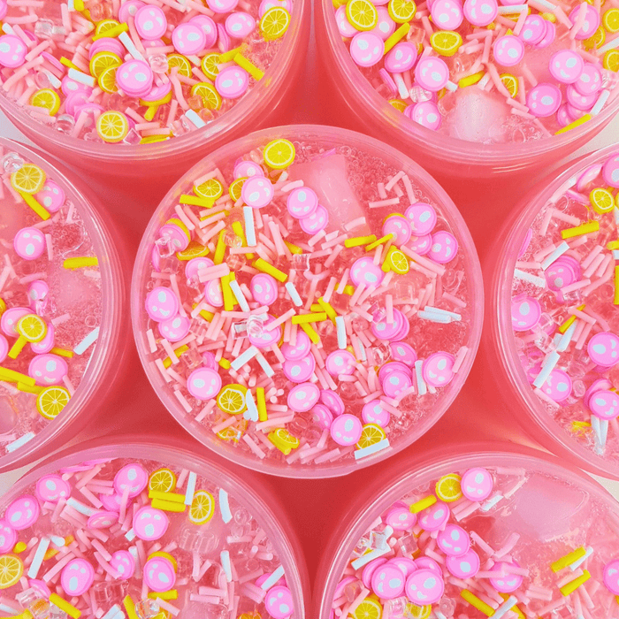 This pink lemonade is oh-so refreshing! Pink jelly cube slime topped with a pink lemon sprinkle mix, scented like lemonade. ππ